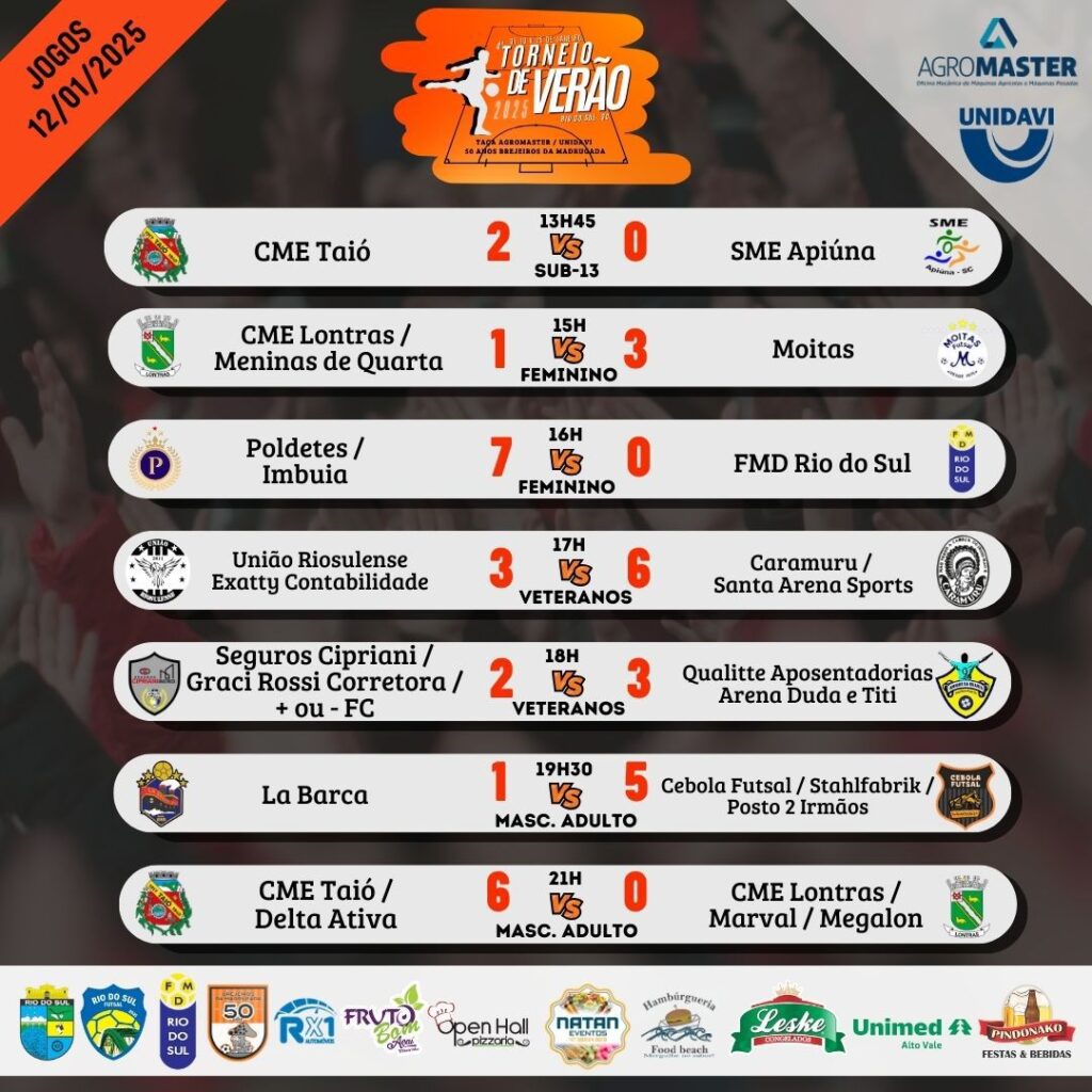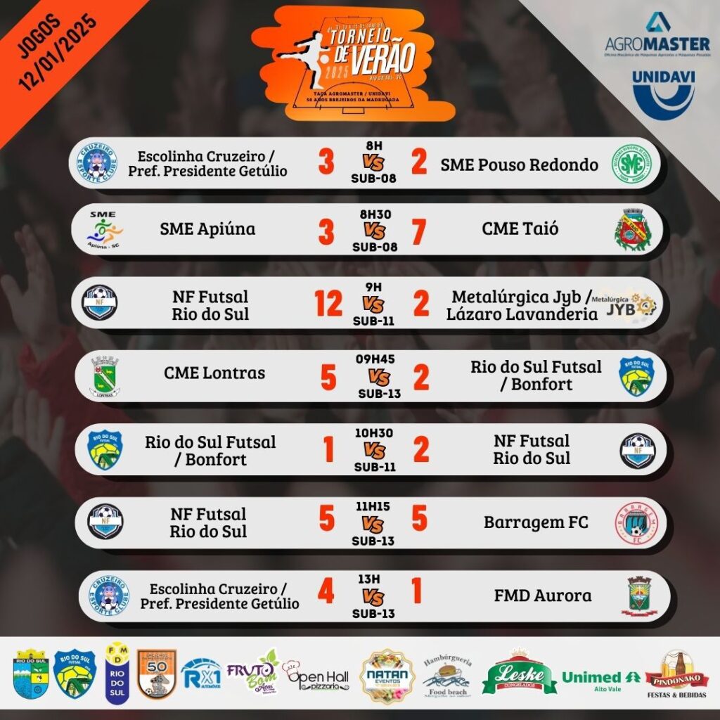 No Sub-13, na chave A, a Escolinha Cruzeiro / Prefeitura de Presidente Getúlio venceu a FMD de Aurora por 4 a 1. Pelo grupo B, a CME de Lontras venceu o Rio do Sul Futsal / Bonfort por 5 a 2.