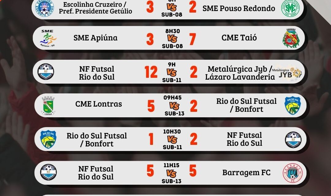 No Sub-11 dois jogos pelo grupo B, o NF Futsal Rio do Sul venceu a Metalúrgica JYB / Lázaro Lavanderia por 12 a 2. Mais tarde a equipe da NF entrou em quadra novamente e venceu o Rio do Sul Futsal / Bonfort por 2 a 1.