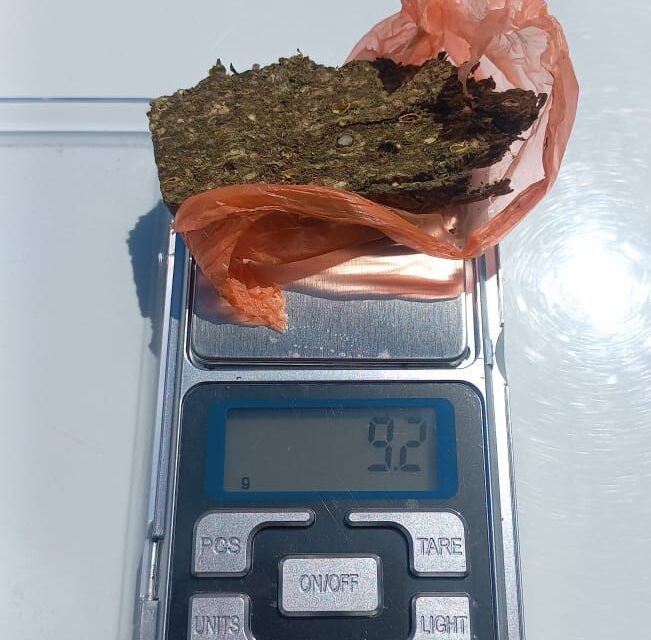 No momento da abordagem o masculino tinha em suas mãos uma pequena porção de substância análoga à maconha, e em uma busca pessoal foi encontrado uma porção de 9,2 g da mesma substância.
