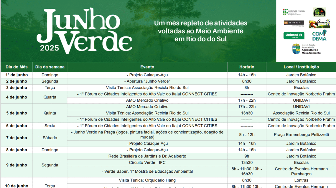No dia 7, a Praça Ermembergo Pellizzetti recebe o evento “Junho Verde na Praça”, com pintura facial, jogos educativos, doação de mudas e ações de conscientização ambiental. A tradicional Mostra de Educação Ambiental “Verde Saber” movimenta o Centro de Eventos Hermann Purnhagen de 9 a 13 de junho com exposições, projetos escolares e trocas de experiências entre educadores.